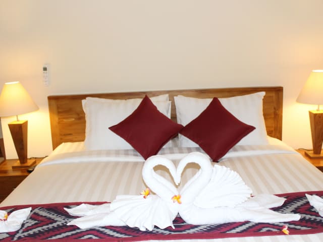 Die Villa Capung Mas Ubud ist ein traumhaftes Hotel, das von einer üppigen tropischen Vegetation umgeben ist und einen Außenpool bietet. Genießen Sie Ihren Aufenthalt in dieser idyllischen Oase, nur wenige Gehminuten vom Markt Ubud entfernt. Das Hotel bietet kostenloses WLAN und ein köstliches Frühstück, das jeden Morgen auf Ihr Zimmer gebracht wird. Die Villen bieten einen atemberaubenden Blick auf den Garten oder den Fluss und verfügen über einen Balkon oder eine Terrasse mit Gartenmöbeln. Die Zimmer sind klimatisiert und mit einem Flachbild-Sat-TV ausgestattet. Im eigenen Bad finden Sie eine Badewanne und eine Dusche. Wenn Sie die Umgebung erkunden möchten, bietet die Villa Capung Mas Ubud auch eine Motorrad- und Autovermietung. Der Palast von Ubud und der Affenwald von Ubud sind nur wenige Gehminuten entfernt. Der internationale Flughafen Denpasar ist ca. 28 km entfernt.
