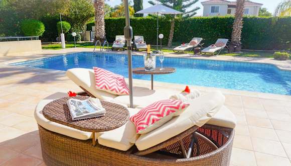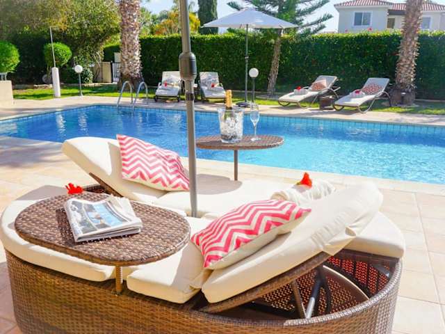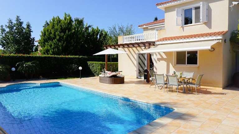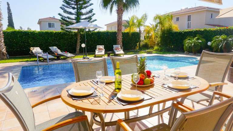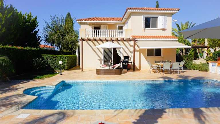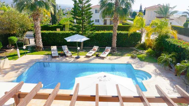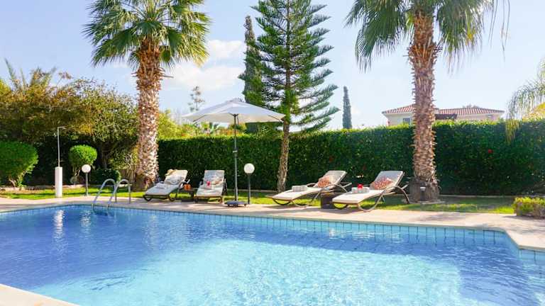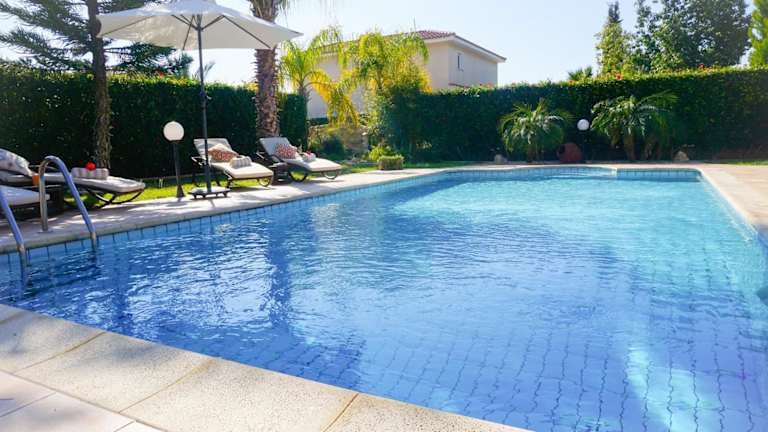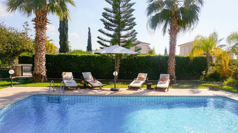 Die Villa bietet einen Außenpool, in dem Sie sich an warmen Tagen abkühlen können. Genießen Sie die Sonne auf der Terrasse oder erkunden Sie die Umgebung und besuchen Sie den Zoo von Paphos oder den Strand Lara. Es gibt viele Möglichkeiten für Outdoor-Aktivitäten in der Nähe.