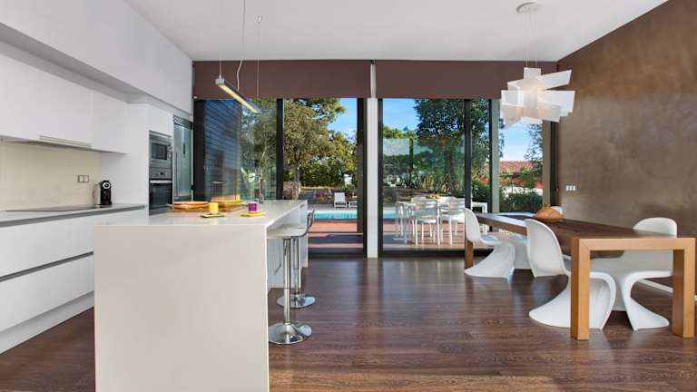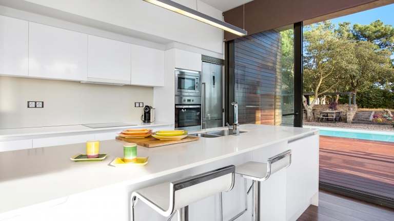 Die Küche ist eingerichtet mit einem Kühlschrank, Geschirrspüler, Ofen und Kaffeemaschine. Weitere Verpflegungsmöglichkeiten sind nicht aufgeführt.