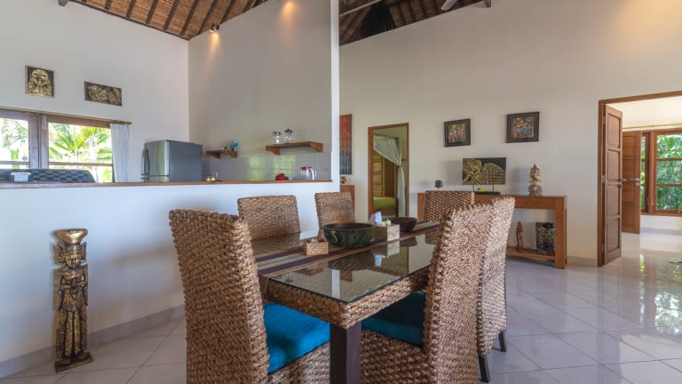 Alle Schlafzimmer verfügen über eine individuell einstellbare Klimaanlage. Drei Schlafzimmer sind mit dekorativen Doppelbett in Bambus-Stil mit Moskitonetz ausgestattet. Das vierte Schlafzimmer verfügt über zwei Einzelbetten, auch mit Moskitonetz. Alle Zimmer verfügen über ein eigenes Badezimmer En-Suite. Bettwäsche, Handtücher und Badetücher sind ausreichend vorhanden und im Preis inbegriffen.