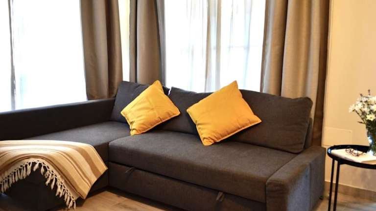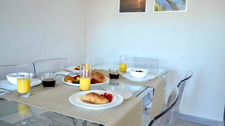 Die Ferienwohnung verfügt über zwei Schlafzimmer, ein Wohnzimmer, eine voll ausgestattete Küche mit Kühlschrank und Kaffeemaschine sowie zwei Badezimmer, die mit Bidet und Dusche ausgestattet sind. Handtücher und Bettwäsche werden bereitgestellt. Die Wohneinheit ist klimatisiert und bietet Gartenblick.