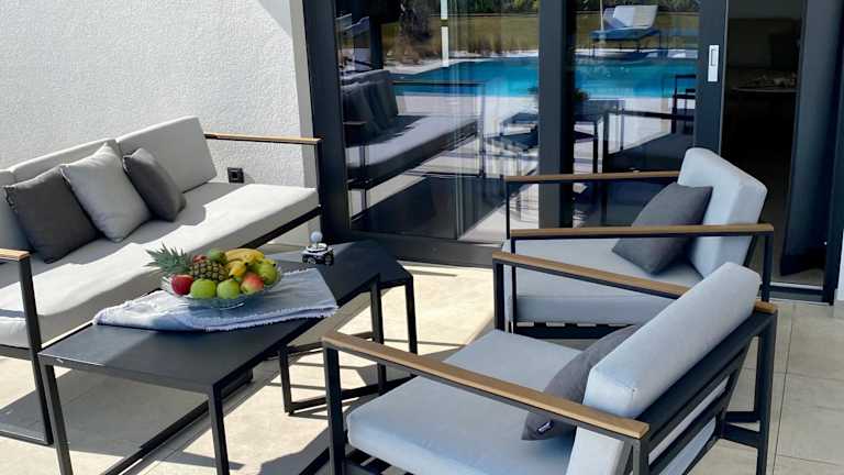 Die Villa umfasst zwei Schlafzimmer, ein Wohnzimmer und eine voll ausgestattete Küche mit Kühlschrank und Kaffeemaschine. Es gibt zwei Badezimmer, die jeweils mit einer Badewanne oder Dusche und einem Whirlpool ausgestattet sind. Handtücher und Bettwäsche werden bereitgestellt.