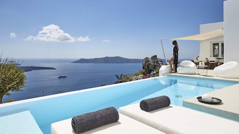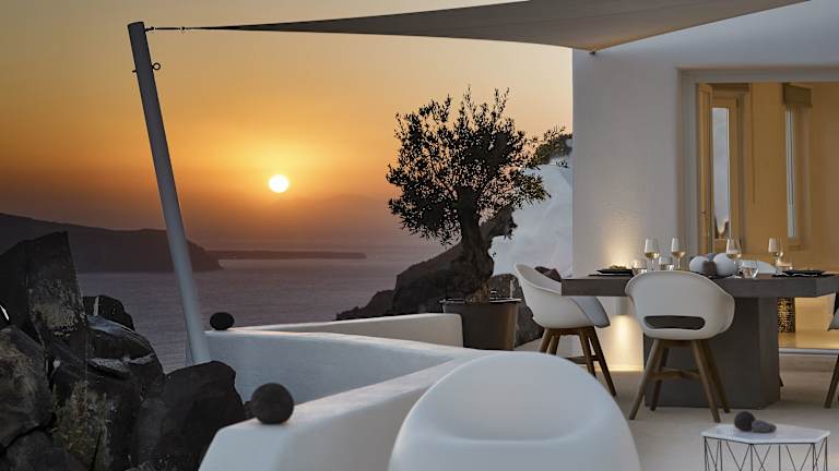 Die Villa Etheras befindet sich in Firostefani am Rande der Klippe mit Blick auf die Caldera und den Vulkan von Santorin.