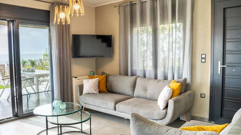 Die Villa Eva Dikella bietet geräumige und komfortable Unterkünfte für einen erholsamen Aufenthalt. Die Villa verfügt über 3 Schlafzimmer, ein gemütliches Wohnzimmer und eine voll ausgestattete Küche mit einem Kühlschrank und einer Kaffeemaschine. Das moderne Badezimmer ist mit einer Dusche und einem Haartrockner ausgestattet. Handtücher und Bettwäsche werden gestellt, um den Gästen den Aufenthalt so angenehm wie möglich zu gestalten. Die klimatisierten Zimmer sorgen für angenehme Temperaturen, und ein Balkon und eine Terrasse bieten einen wunderschönen Blick auf das Meer.