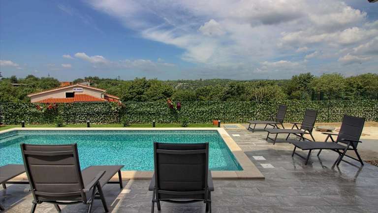 Die Villa bietet einen Außenpool sowie eine Terrasse mit Sonnenliegen und Sonnenschirmen, die zur Entspannung einladen. Ein Kinderspielplatz ist ebenfalls vorhanden.