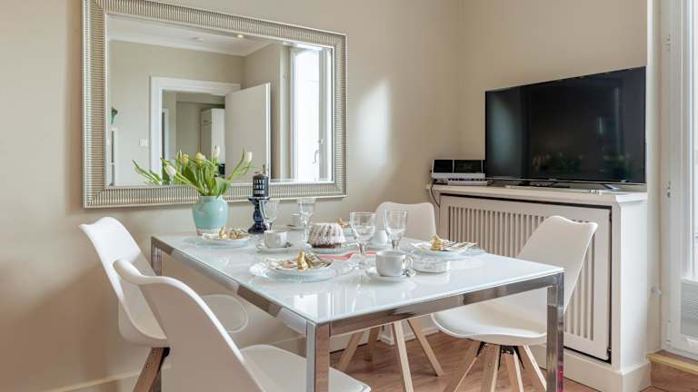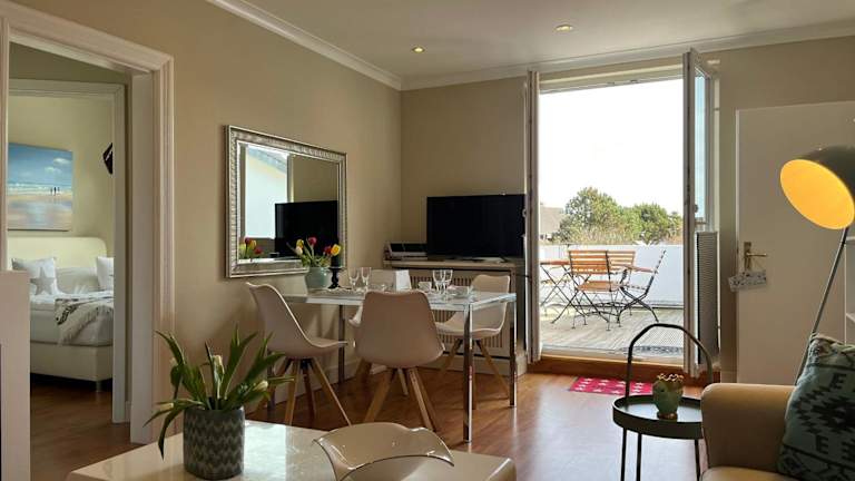 Die Ferienwohnung umfasst 2 Schlafzimmer und ist mit einer voll ausgestatteten Küche ausgestattet, die einen Kühlschrank und einen Geschirrspüler beinhaltet. Ein Badezimmer mit Dusche und Haartrockner ist ebenfalls vorhanden. Zur Unterhaltung steht ein TV zur Verfügung.