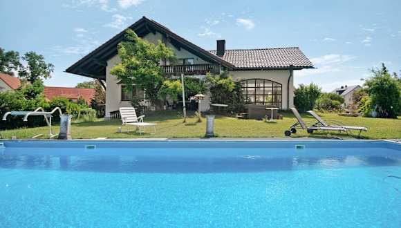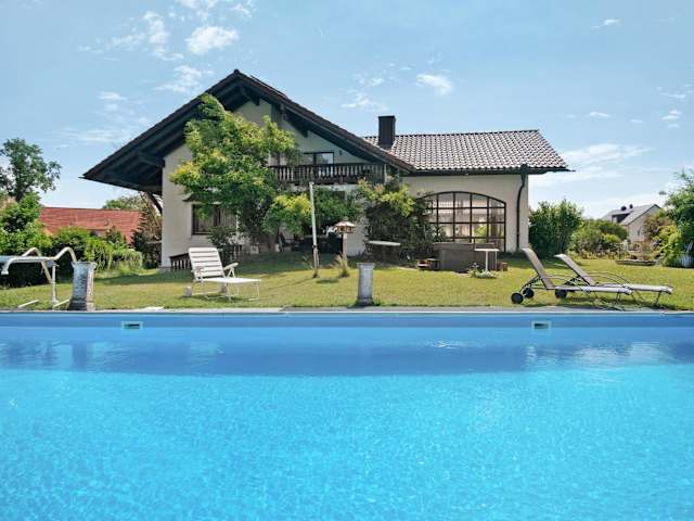 Gäste können im Außenpool schwimmen, im Garten entspannen oder Aktivitäten wie Wandern und Fahrradfahren genießen.