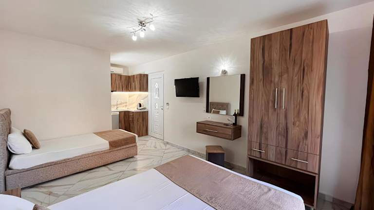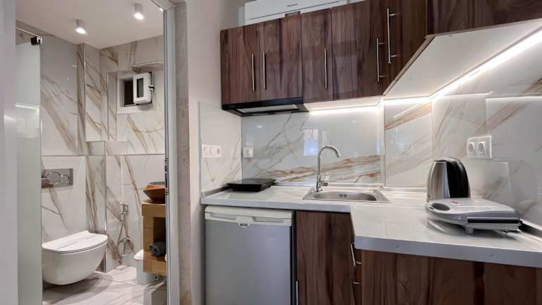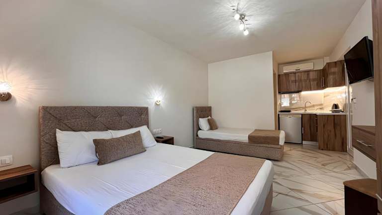 Die Zimmer sind mit Klimaanlage, einer voll ausgestatteten Küchenzeile, einem Flachbild-TV und einem eigenen Badezimmer ausgestattet. Zu den Einrichtungen gehören eine Badewanne oder Dusche, kostenlose Pflegeprodukte, ein Haartrockner, ein Kühlschrank, eine Herdplatte und ein Wasserkocher.