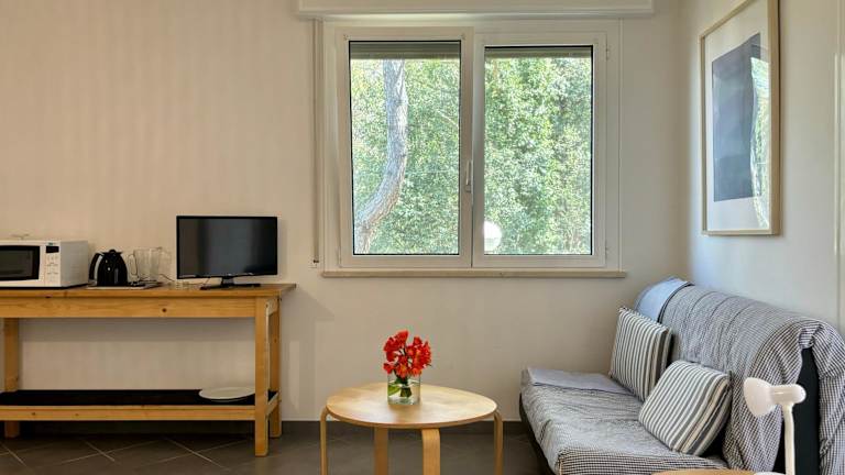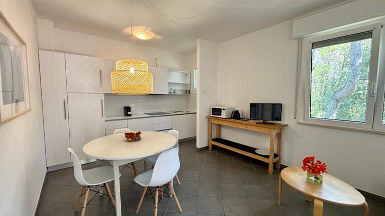 Die Ferienwohnung umfasst 2 Schlafzimmer und ein Wohnzimmer. Sie ist mit einer voll ausgestatteten Küche mit Kühlschrank und Kaffeemaschine ausgestattet. Ein Badezimmer mit Bidet und Dusche ist ebenfalls vorhanden. Handtücher und Bettwäsche werden bereitgestellt, und die Unterkunft verfügt über Klimaanlage.
