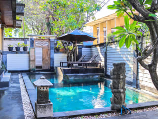 Da es sich um eine Unterkunft zur Selbstverpflegung handelt, können Sie Ihre eigenen Mahlzeiten zubereiten. Es gibt jedoch auch viele Restaurants in der Umgebung, in denen Sie köstliche lokale und internationale Gerichte genießen können. Besonders zu empfehlen ist ein Abendessen mit Meeresfrüchten am Strand Kedonganan, begleitet von einem atemberaubenden Sonnenuntergang.