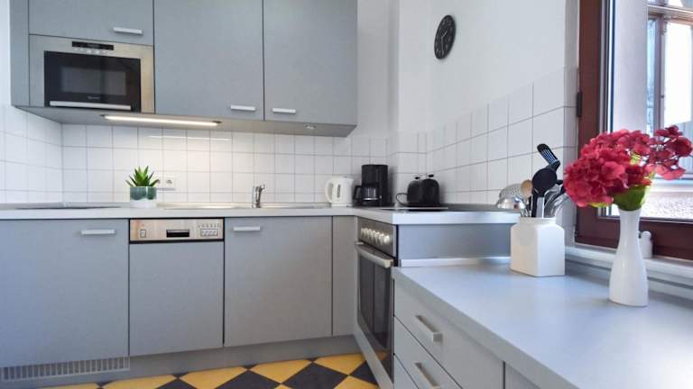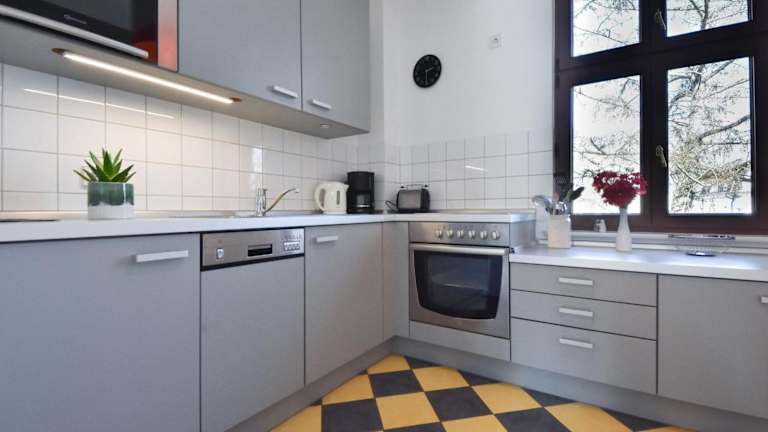 Die Ferienwohnung verfügt über zwei Schlafzimmer, eine gut ausgestattete Küche mit Kühlschrank und Geschirrspüler sowie ein Badezimmer mit Dusche und Haartrockner. Handtücher und Bettwäsche werden bereitgestellt.
