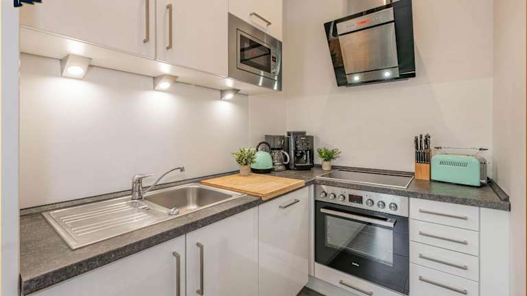 Das Apartment umfasst zwei Schlafzimmer, einen Fernseher sowie eine voll ausgestattete Küche. Diese beinhaltet einen Kühlschrank, einen Geschirrspüler, eine Waschmaschine, einen Ofen und eine Mikrowelle.
