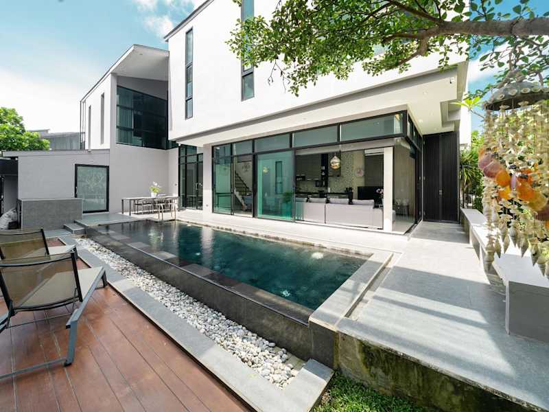 Die Villa Lami ist eine luxuriöse Loftvilla mit drei Schlafzimmern, eigenem Pool, Fitnessstudio und Sauna in Phuket. Diese Unterkunft bietet eine erstklassige Ausstattung und liegt in der Nähe des Bangtao Beach und der Boat Avenue. Genießen Sie den Außenpool, die Terrasse und den privaten Garten. Die Villa verfügt über eine voll ausgestattete Küche, vier Badezimmer und bietet kostenfreies WLAN. Entspannen Sie in der Sauna oder erkunden Sie die nahe gelegenen Sehenswürdigkeiten wie den Tempel Wat Prathong und den Nationalpark Khao Phra Thaeo. Der internationale Flughafen Phuket ist nur 17 km entfernt.