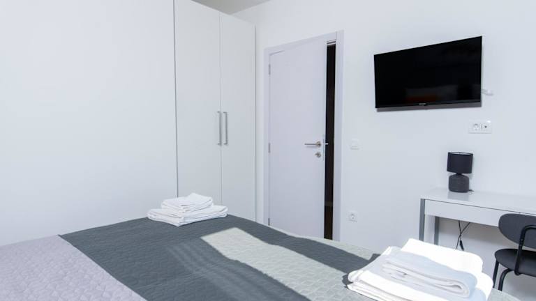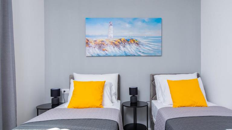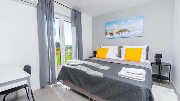 Die Villa ist klimatisiert und besteht aus zwei Schlafzimmern, einem Wohnzimmer sowie einer voll ausgestatteten Küche, die mit einem Kühlschrank und einer Kaffeemaschine ausgestattet ist. Die Unterkunft verfügt über zwei Badezimmer, die mit einem Bidet und einer Dusche ausgestattet sind. Handtücher und Bettwäsche werden gestellt und entsprechen den Richtlinien der örtlichen Behörden.
