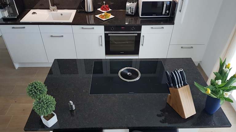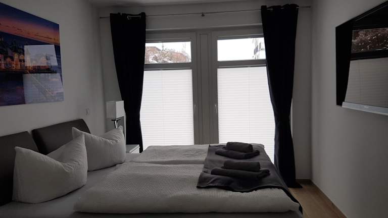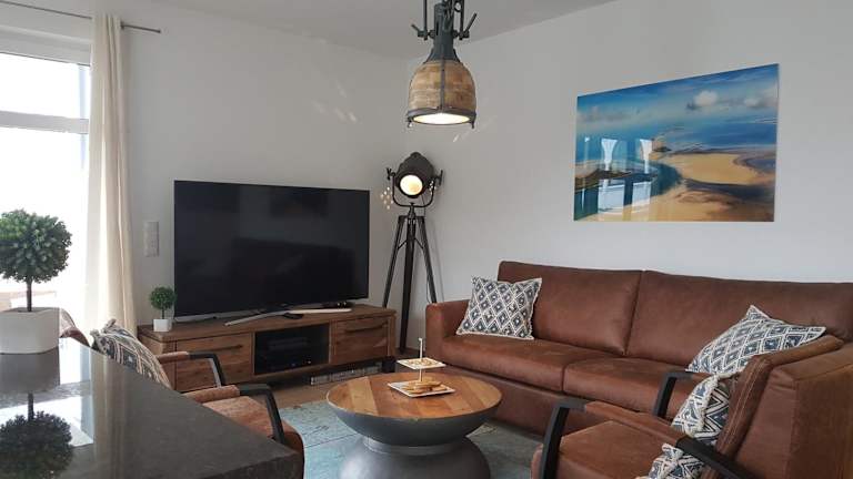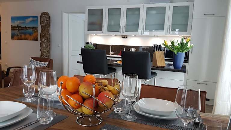 Die Ferienwohnung verfügt über eine gut ausgestattete Küche mit Kühlschrank, Geschirrspüler und Ofen. Des Weiteren besteht sie aus einem Wohnzimmer, einem Essbereich, zwei Schlafzimmern und zwei Badezimmern mit Dusche. Bei Bedarf können Handtücher und Bettwäsche gegen Aufpreis bereitgestellt werden.