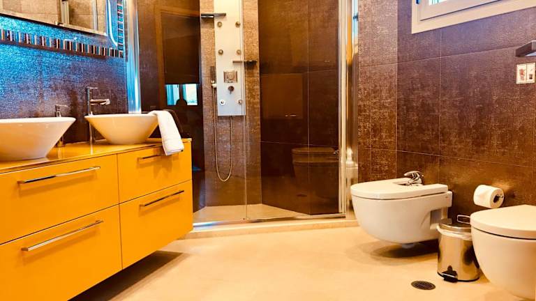 Das Lydia's House bietet klimatisierte Unterkünfte auf drei Ebenen. Im Erdgeschoss finden Sie ein geräumiges Wohnzimmer, eine voll ausgestattete Küche mit Essbereich, ein Büro und ein Gäste-WC. Die Schlafzimmer befinden sich auf der ersten Etage und bieten Platz für bis zu sechs Personen. Das große Badezimmer verfügt über eine Hydromassage-Säule für zusätzlichen Komfort. Im Dachgeschoss befinden sich zwei Einzelbetten. Zur Ausstattung des Hauses gehören auch ein Backofen, eine Mikrowelle, ein Geschirrspüler, eine Waschmaschine und ein Haartrockner. Kostenloses WLAN ist in allen Bereichen verfügbar.