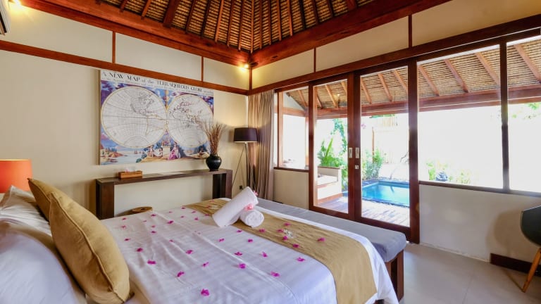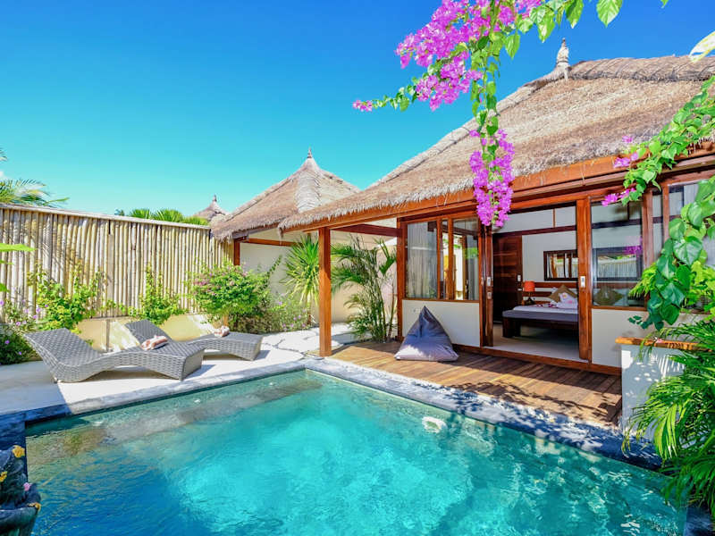 Die Villa Marina auf Gili Air bietet komfortable Unterkünfte mit eigenem Außenpool und kostenfreiem WLAN. Die Zimmer sind gemütlich eingerichtet und verfügen über eine Terrasse, einen Sitzbereich und einen Essbereich. Zur Ausstattung gehören auch eine Minibar und ein Wasserkocher. Entspannen Sie im Garten und genießen Sie ein erfrischendes Getränk an der Bar. Die Umgebung eignet sich perfekt zum Schnorcheln, Tauchen und Fahrradfahren.