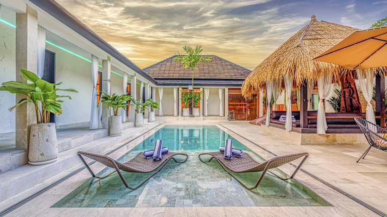 Die Unterkunft Villa Matahari - Seminyak bietet Übernachtungsmöglichkeiten in einer luxuriösen Villa mit kostenlosem WLAN, Klimaanlage und einem Außenpool. Die Villa verfügt über einen eigenen Pool und ist ausgestattet mit 3 Schlafzimmern, 3 Badezimmern, einer voll ausgestatteten Küche sowie eine Veranda/Patio mit Blick auf den Pool.