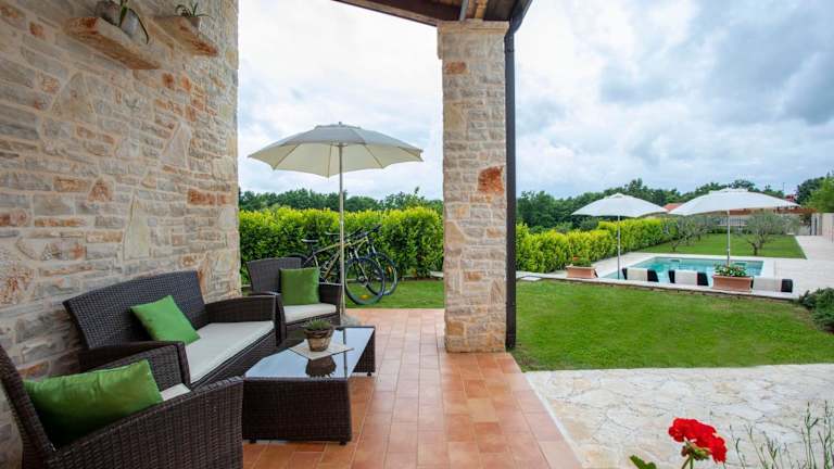 Die Villa verfügt über zwei Schlafzimmer, ein Wohnzimmer mit Flachbild-TV, eine gut ausgestattete Küche mit Kühlschrank und Geschirrspüler sowie ein Badezimmer mit Dusche. Handtücher und Bettwäsche sind vorhanden. Eine Terrasse mit Poolblick und Gartenmöbeln ergänzt die Zimmerausstattung.