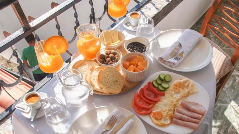 Beim Frühstück stehen verschiedene Optionen zur Verfügung, darunter kontinentale, italienische oder vegetarische Speisen.