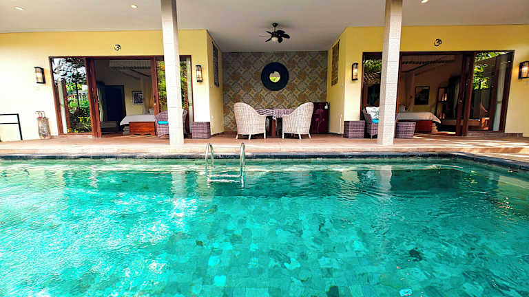 Die Villa Nirvana bietet 6 Zimmer in einem 1-stöckigen Haupthaus und 6 Nebengebäuden. Jedes Zimmer ist komfortabel und modern eingerichtet und verfügt über ein eigenes halboffenes Badezimmer. Schiebetüren führen zum privaten Pool und Garten. Zur Ausstattung gehören auch ein Flachbild-Sat-TV, ein Safe und kostenfreies WLAN.