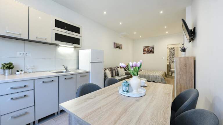 Die Zimmer in der Unterkunft Villa Nita sind mit Klimaanlage und kostenlosem WLAN ausgestattet. Die Gäste finden in den Räumlichkeiten einen Sitzbereich, einen Satelliten-Flachbild-TV sowie eine voll ausgestattete Küche mit Kühlschrank, Ofen, Herdplatte, Toaster, Kaffeemaschine und Wasserkocher vor. Jedes Zimmer verfügt über ein eigenes Badezimmer, das mit einer Dusche und kostenlosen Pflegeprodukten ausgestattet ist.