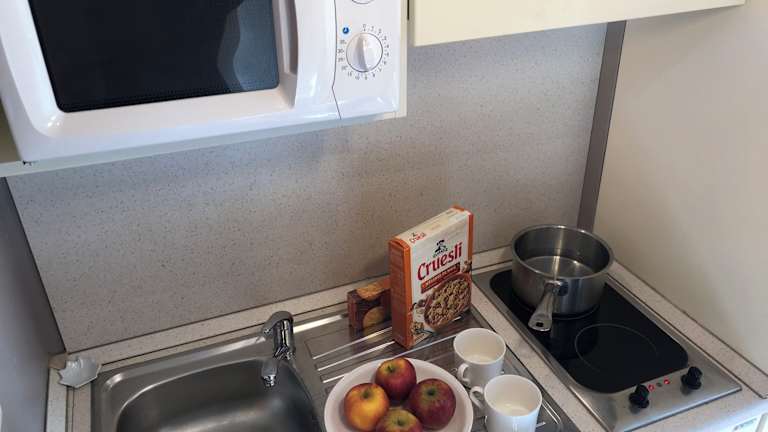 Das Frühstück wird gegen einen Aufpreis angeboten. Ein Café ist vor Ort verfügbar. Für die Zubereitung eigener Mahlzeiten bieten die Apartments eine Küchenzeile mit Kochplatten und Mikrowelle, während einige Zimmer über keine Speiseeinrichtungen verfügen.