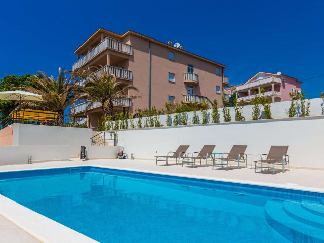 Die Apartments der Villa Ria bieten geräumige Unterkünfte auf 2 Etagen. Mit einer Größe von 160 m2 haben Sie ausreichend Platz, um sich wohlzufühlen. Jedes Apartment verfügt über eine eigene Terrasse, auf der Sie entspannen und den Blick auf das Meer genießen können. Die Apartments sind gut ausgestattet und bieten alles, was Sie für einen komfortablen Aufenthalt benötigen.