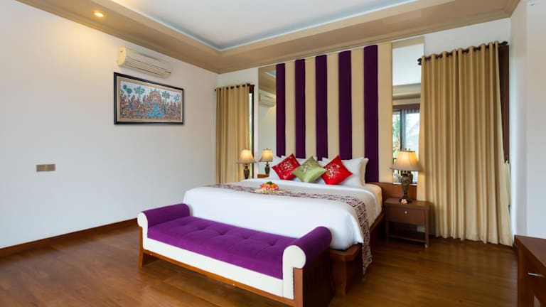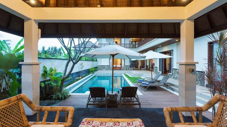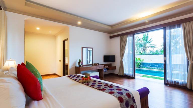 Die Zimmer in der Villa Sabasanti Gianyar sind komfortabel und stilvoll eingerichtet. Jedes Zimmer verfügt über einen eigenen Balkon mit Blick auf den Pool. Die Zimmer sind klimatisiert und mit einem Flachbild-TV ausgestattet. Das eigene Badezimmer bietet eine Dusche, kostenfreie Pflegeprodukte und einen Haartrockner. Kostenloses WLAN steht den Gästen in allen Zimmern zur Verfügung.