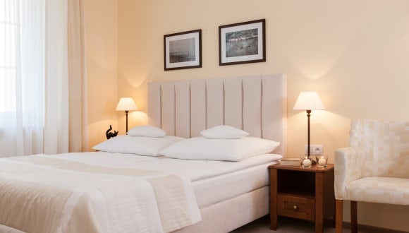 Die Zimmer in der Villa Sedina sind hell und klassisch eingerichtet und bieten allen Komfort, den Sie für einen angenehmen Aufenthalt benötigen. Jedes Zimmer verfügt über einen gemütlichen Sitzbereich, Sat-TV und ein modernes Badezimmer mit Dusche. Genießen Sie den Komfort und die Ruhe Ihrer eigenen Unterkunft.
