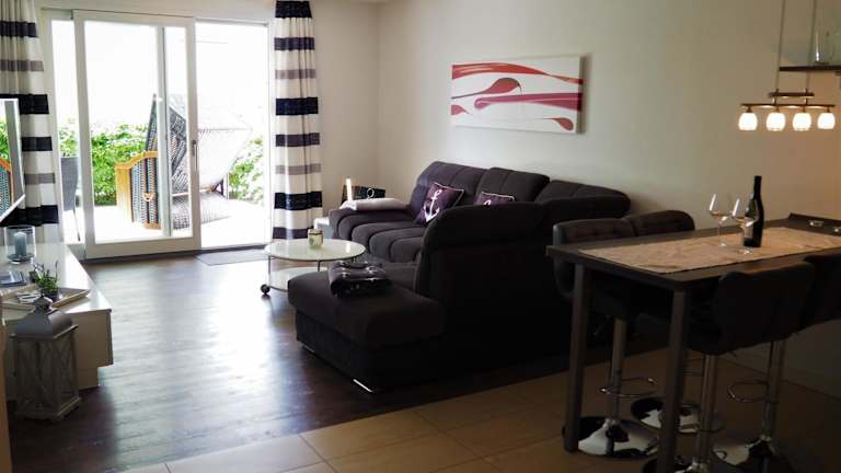 Die Ferienwohnung umfasst ein Schlafzimmer, ein Badezimmer mit Dusche, ein Wohnzimmer, einen Essbereich sowie eine voll ausgestattete Küche mit Kühlschrank, Geschirrspüler und Ofen. Ein Blu-ray-Player steht zur Verfügung. Handtücher und Bettwäsche können gegen Aufpreis ausgeliehen werden; diese müssen vor der Ankunft gebucht werden.