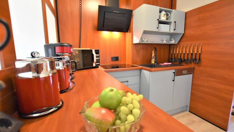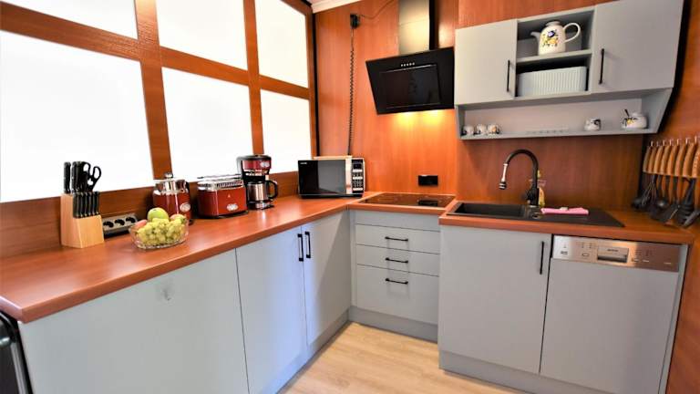 Die Unterkunft bietet eine voll ausgestattete Küche mit Kühlschrank und Geschirrspüler. Handtücher und Bettwäsche können gegen Aufpreis bereitgestellt werden.