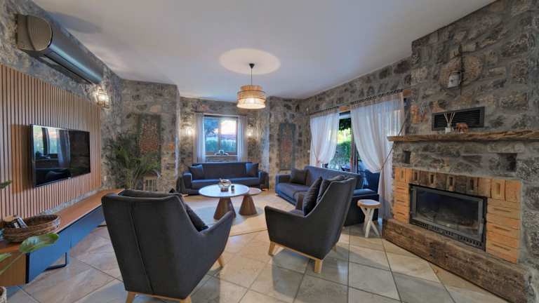Die klimatisierte Villa in den Villas Kayaköy ist komfortabel und gemütlich eingerichtet und bietet alles, was Sie für einen entspannten Aufenthalt benötigen. Zur Ausstattung gehören ein TV, ein Balkon mit Pool- und Bergblick sowie ein Kamin für die Wintermonate. Sie können sich auch im Garten, auf der Terrasse oder am Grillplatz entspannen. Kostenlose Parkplätze stehen ebenfalls zur Verfügung.