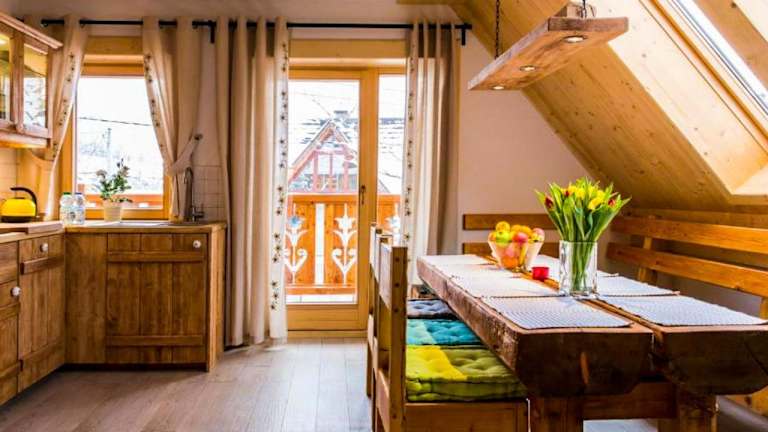 Die Wohneinheiten in der Villa Szymoszkowa SKI sind komfortabel und gemütlich eingerichtet. Jede Wohneinheit verfügt über Parkettböden, eine voll ausgestattete Küche mit Kühlschrank, Essbereich und Kochmöglichkeiten. Ein Flachbild-Sat-TV sorgt für Unterhaltung und das eigene Bad ist mit einer Dusche und einem Haartrockner ausgestattet. Ein Geschirrspüler, ein Kochfeld, eine Kaffeemaschine und ein Wasserkocher sind ebenfalls vorhanden.