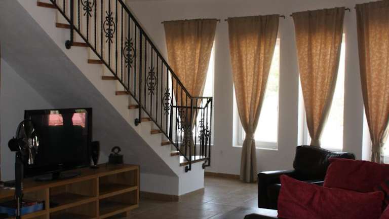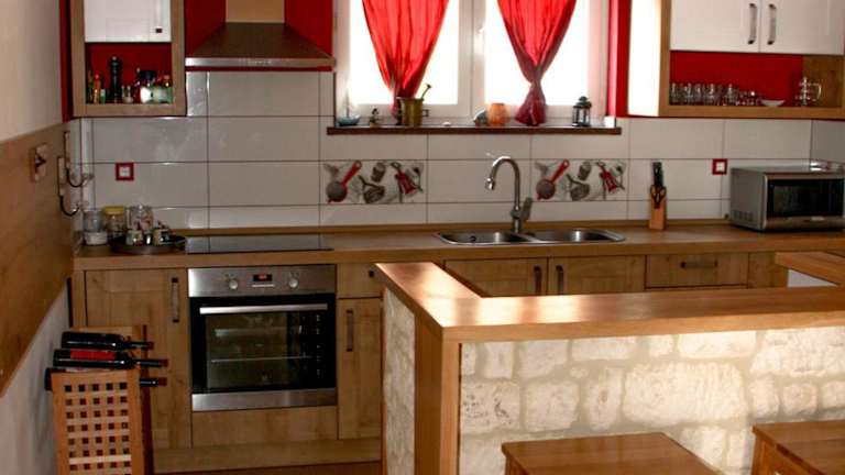 Die Villa umfasst eine Küche mit Kühlschrank, Geschirrspüler und Ofen, sowie einen Essbereich im Wohnzimmer.