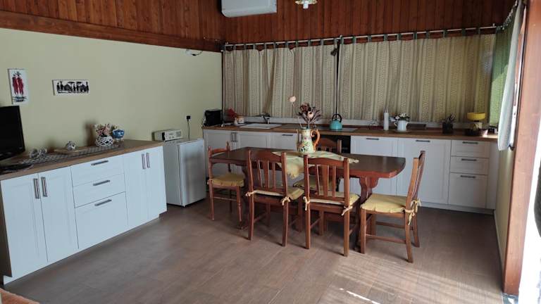 Das Ferienhaus bietet ein separates Schlafzimmer und eine voll ausgestattete Küche, die mit Kühlschrank und Ofen ausgestattet ist. Das Badezimmer ist ebenfalls vorhanden. Handtücher und Bettwäsche werden bereitgestellt. Die Klimaanlage sorgt für einen angenehmen Aufenthalt.