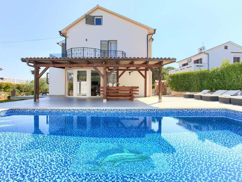 Die Villa Tereza in Malinska bietet Ihnen einen komfortablen Aufenthalt mit Balkon und Zugang zu einer Terrasse. Das Ferienhaus verfügt über 4 Schlafzimmer, eine voll ausgestattete Küche und 3 Badezimmer. Entspannen Sie im Außenpool und erkunden Sie die nahegelegenen Strände und Sehenswürdigkeiten.