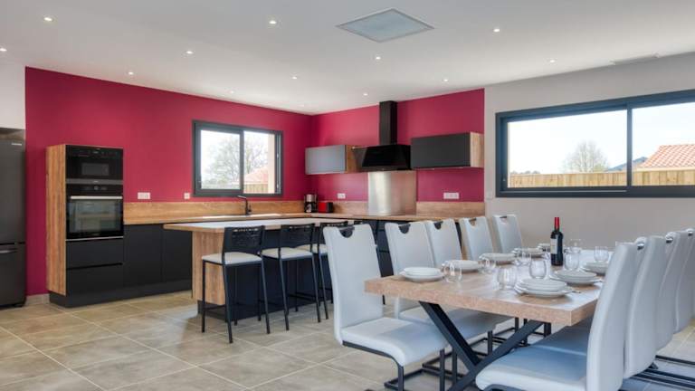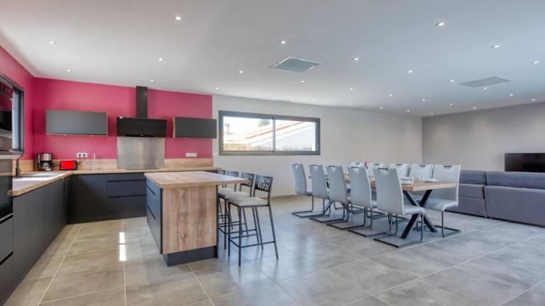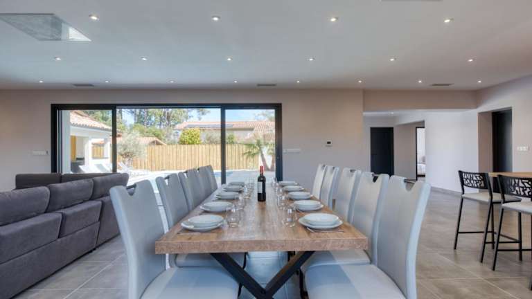 Die Villa bietet fünf Schlafzimmer und ist mit einer gut ausgestatteten Küche inklusive Kühlschrank und Geschirrspüler ausgestattet. Des Weiteren stehen drei Badezimmer mit Dusche, Haartrockner und Waschmaschine zur Verfügung. Ein TV ist ebenfalls vorhanden.