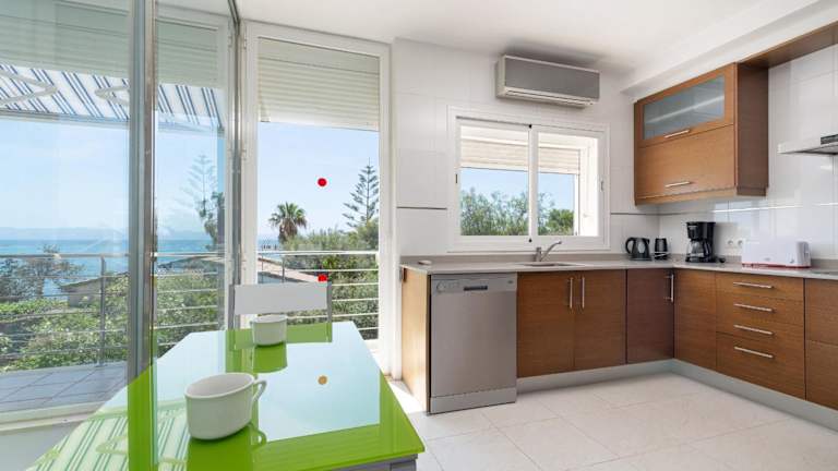 Die Villa umfasst 4 Schlafzimmer, 3 Badezimmer, einen TV, eine voll ausgestattete Küche und eine Terrasse mit Meerblick.