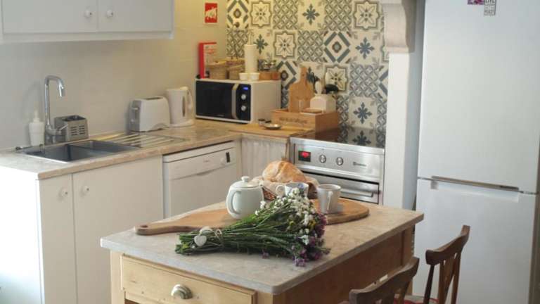 Die Unterkunft verfügt über eine voll ausgestattete Küche mit Kühlschrank, Geschirrspüler, Mikrowelle, Herdplatte, Kaffeemaschine und Wasserkocher.