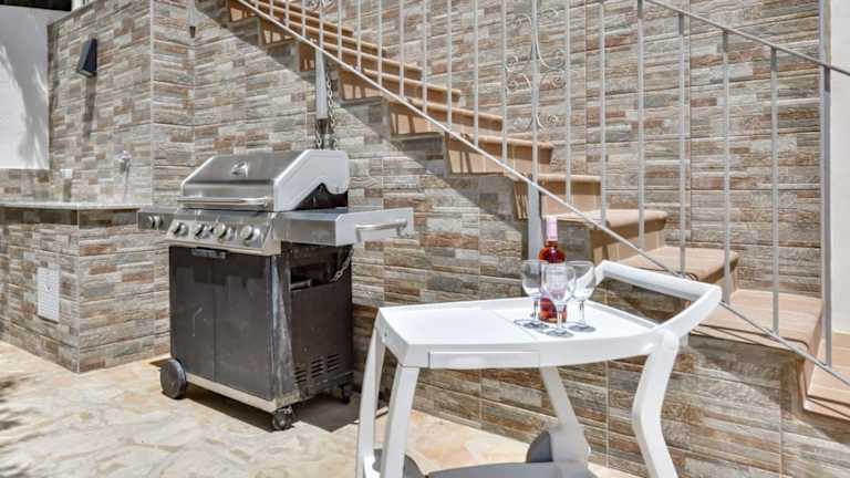 Die Villa umfasst 2 Schlafzimmer, ein Wohnzimmer, eine voll ausgestattete Küche mit Kühlschrank und Kaffeemaschine sowie 3 Badezimmer mit Dusche und Badewanne. Der Zugang ist nur zum Erdgeschoss möglich, das Obergeschoss ist geschlossen und nicht bewohnt.