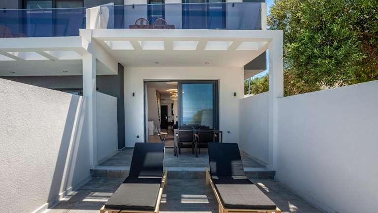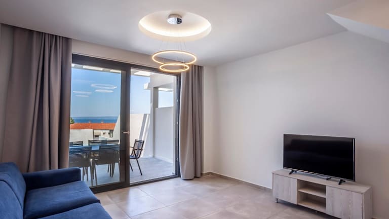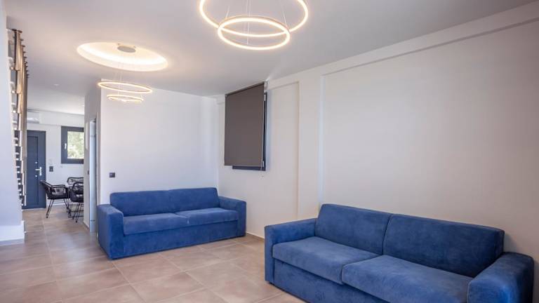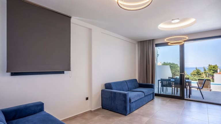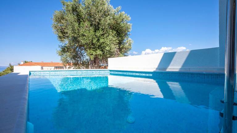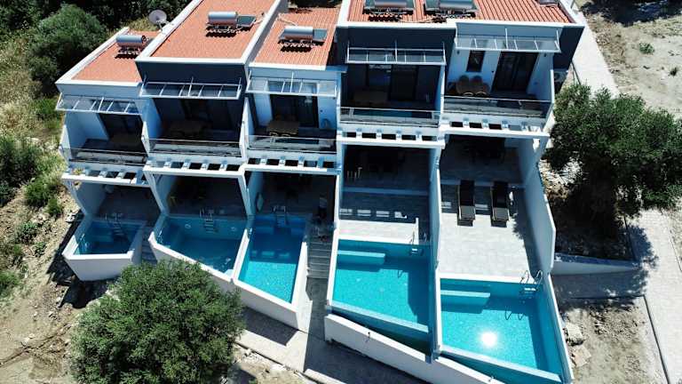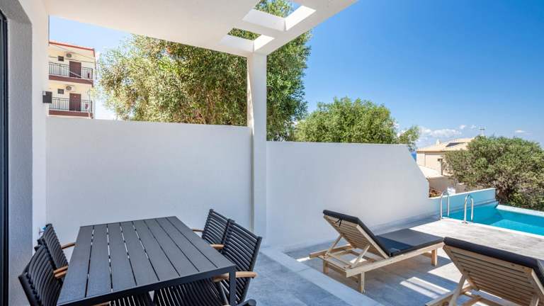 "Die Villas Kaiafa ""Ismini"" bieten komfortable Unterkünfte mit modernen Annehmlichkeiten. Jede Villa ist klimatisiert und verfügt über einen Whirlpool, der für zusätzliche Entspannung sorgt. Die Terrasse bietet einen herrlichen Blick auf die Stadt und die Unterkunft bietet auch einen gemütlichen Sitzbereich und einen Flachbild-TV. Die voll ausgestattete Küche ermöglicht es Ihnen, Ihre eigenen Mahlzeiten zuzubereiten, und das private Badezimmer ist mit einer Dusche und einem Haartrockner ausgestattet. Genießen Sie den Poolblick von Ihrem eigenen Balkon aus."