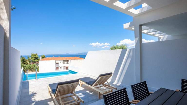 "Die Villas Kaiafa ""Ismini"" befinden sich in Polychrono und bieten eine ideale Lage für einen erholsamen Strandurlaub. Der Strand von Polychrono ist nur 700 m entfernt und der Strand von Kassandra Pallace ist ebenfalls leicht erreichbar. Die Umgebung bietet eine malerische Kulisse mit vielen Möglichkeiten zum Entspannen und Sonnenbaden. Der Flughafen Thessaloniki ist ebenfalls gut erreichbar, etwa 87 km von den Villas entfernt."