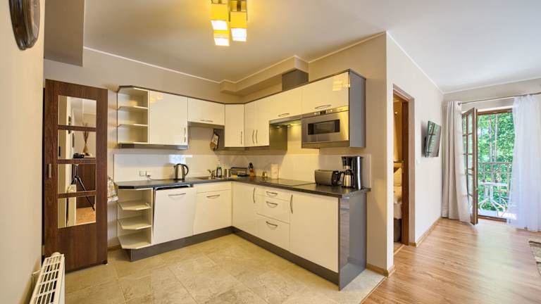 In der voll ausgestatteten Küchenzeile des VisitZakopane - Dubaj Apartments können Sie Ihre eigenen Mahlzeiten zubereiten. Alternativ können Sie auch eines der vielen Restaurants in der Nähe besuchen und die polnische Küche genießen. Die Promenade Krupówki ist nur wenige Gehminuten entfernt und bietet eine Vielzahl von Restaurants und Cafés, in denen Sie lokale Spezialitäten probieren können.