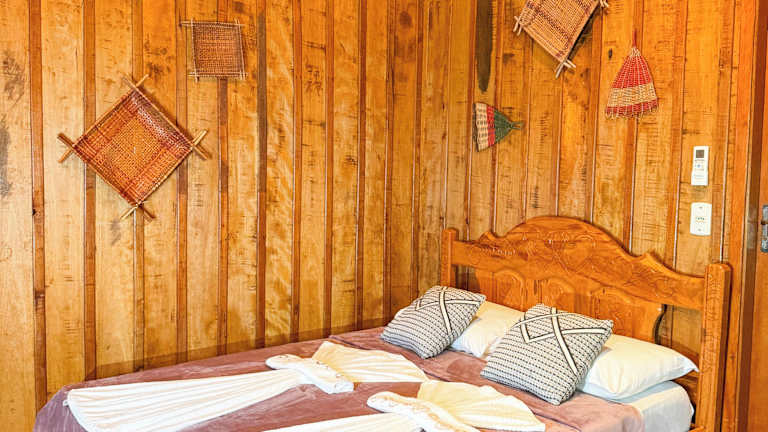 Die Zimmer in der Vista do Lago Jungle Lodge verfügen alle über ein eigenes Bad und bieten den Gästen Komfort und Privatsphäre. Die Einrichtung ist gemütlich und lädt zum Entspannen ein.