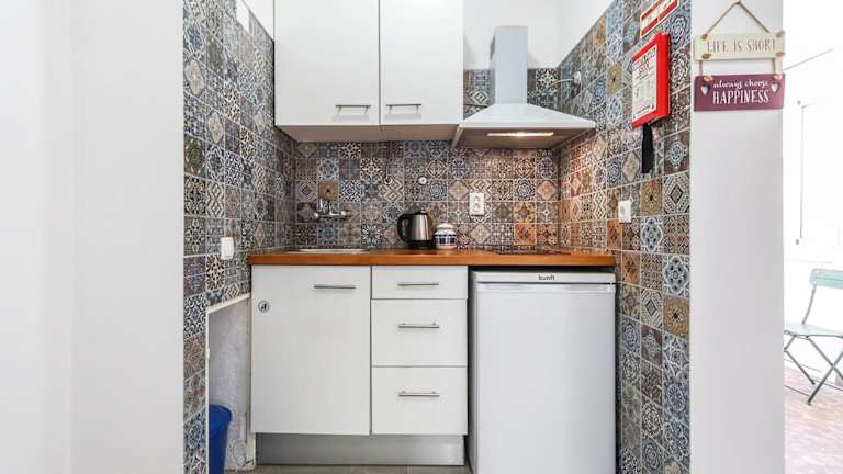 Die Ferienwohnung besteht aus einem Schlafzimmer, einer Küche, die mit einem Kühlschrank und einer Mikrowelle ausgestattet ist, sowie einem Badezimmer mit Dusche, Haartrockner und Waschmaschine.