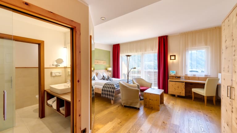 Das Vitalpina Hotel Waldhof bietet 45 verschiedene Zimmer von einfache Doppelzimmer bis Familienzimmer und Suiten. Ausgestattet sind die Zimmer alle mit Satelliten-Tv, Badezimmer mit Dusche oder Badewanne. Kostenlos für den Aufenthalt stehen den Gästen Bademäntel und Badeschuhe zur Verfügung.