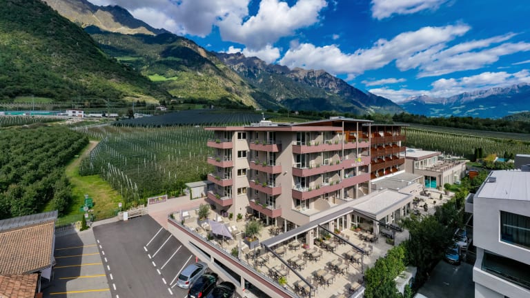 Das Vitalpina Hotel Waldhof liegt auf ca. 550 Höhenmeter nahe der Texelbahn im Untervinschgau zwischen Meran und Naturns.