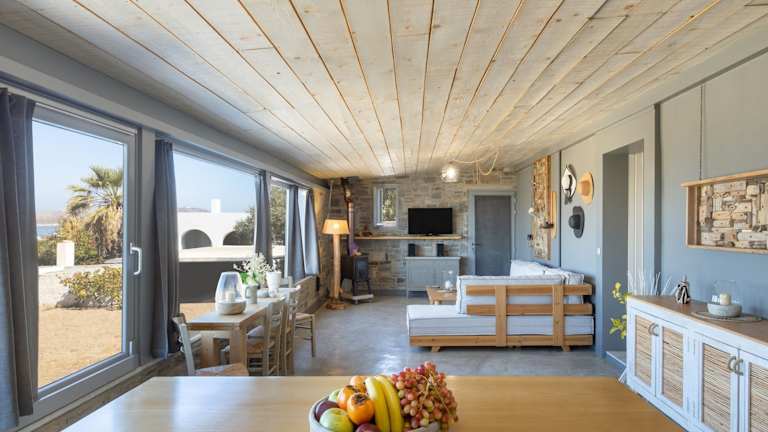 Vitamine Sea House - Island Living Paros bietet eine Unterkunft direkt am Strand mit Meerblick, einem Garten und einer Terrasse. Diese Ferienhausunterkunft ist klimatisiert und bietet einen kostenlosen Privatparkplatz sowie kostenfreies WLAN. Ein Mindestalter von 18 Jahren ist für den Check-in erforderlich, und die Unterkunft wird von einem privaten Gastgeber geführt. Feiertagsfeiern sind nicht gestattet.