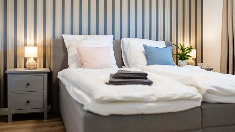 Die Ferienwohnung verfügt über 2 Schlafzimmer, ein Wohnzimmer, ein Badezimmer mit Dusche sowie eine gut ausgestattete Küche. Zur Ausstattung gehören ein Flachbild-TV, ein Kühlschrank, ein Geschirrspüler, Handtücher und Bettwäsche.